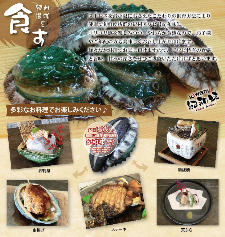 「清」…良質な海水、「食」…地元産わかめ、「住」…大型水槽の恵まれた環境の下で、じっくりと真面目に湯浅湾で育まれた紀州アワビ【紀和味】。